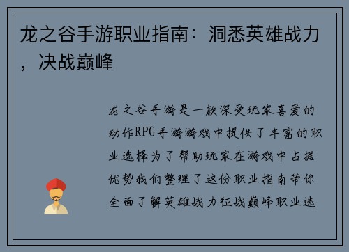 龙之谷手游职业指南:洞悉英雄战力,决战巅峰