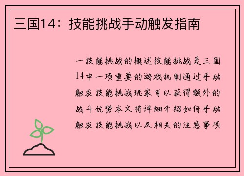 技能挑战是《三国14》中一项重要的游戏机制,通过手动触发技能挑战,玩家可以获得额外的战斗优势。本文将详细介绍如何手动触发技能挑战,以及相关的注意事项和策略。